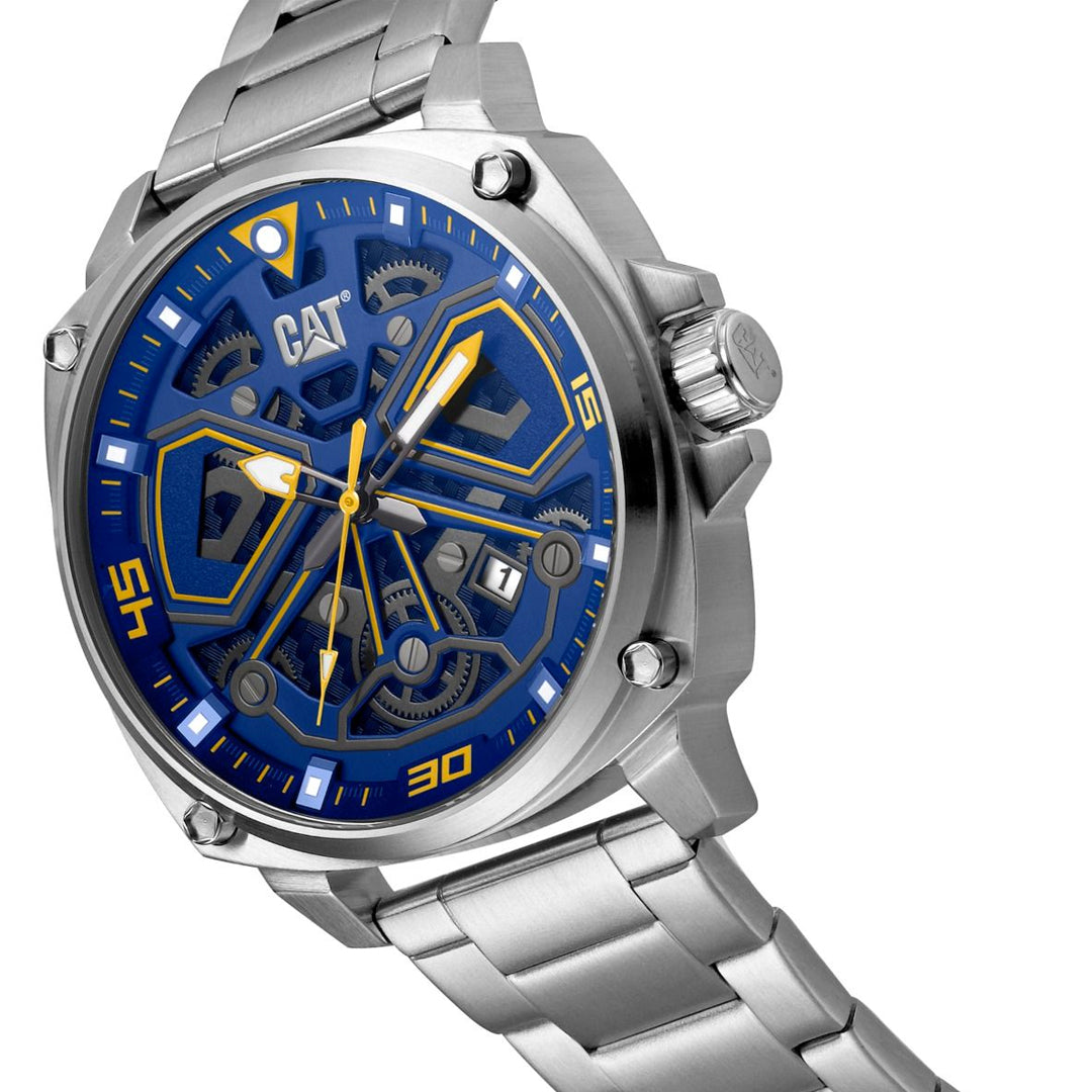 Built with the same robust engineering principles that define CAT’s heavy-duty machinery, this timepiece brings industrial strength and precision to your wrist. The 44mm stainless steel case houses a striking blue and yellow face with visible gear-like detailing - channeling CAT’s rugged aesthetic into a bold design statement.